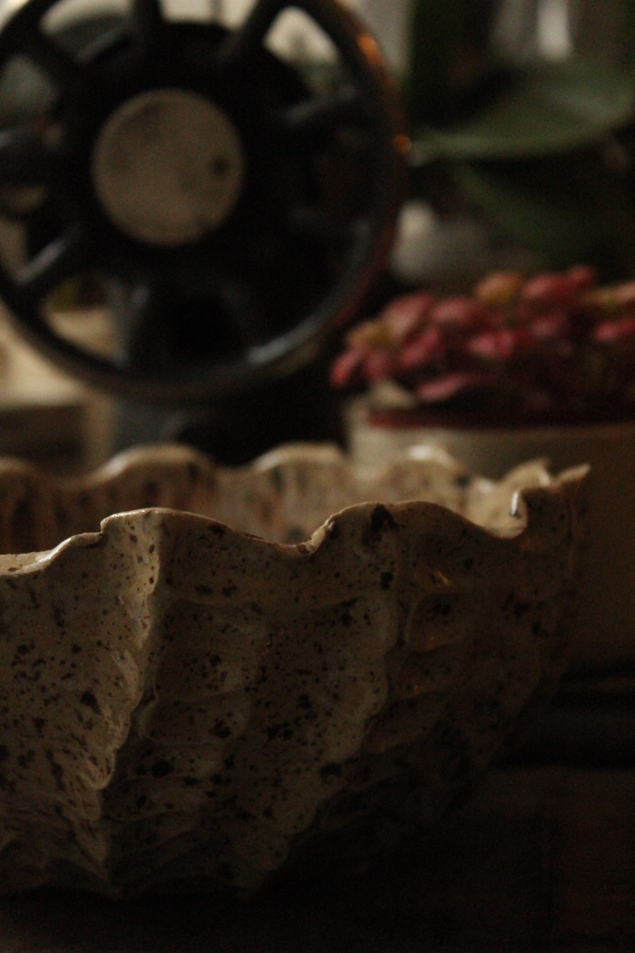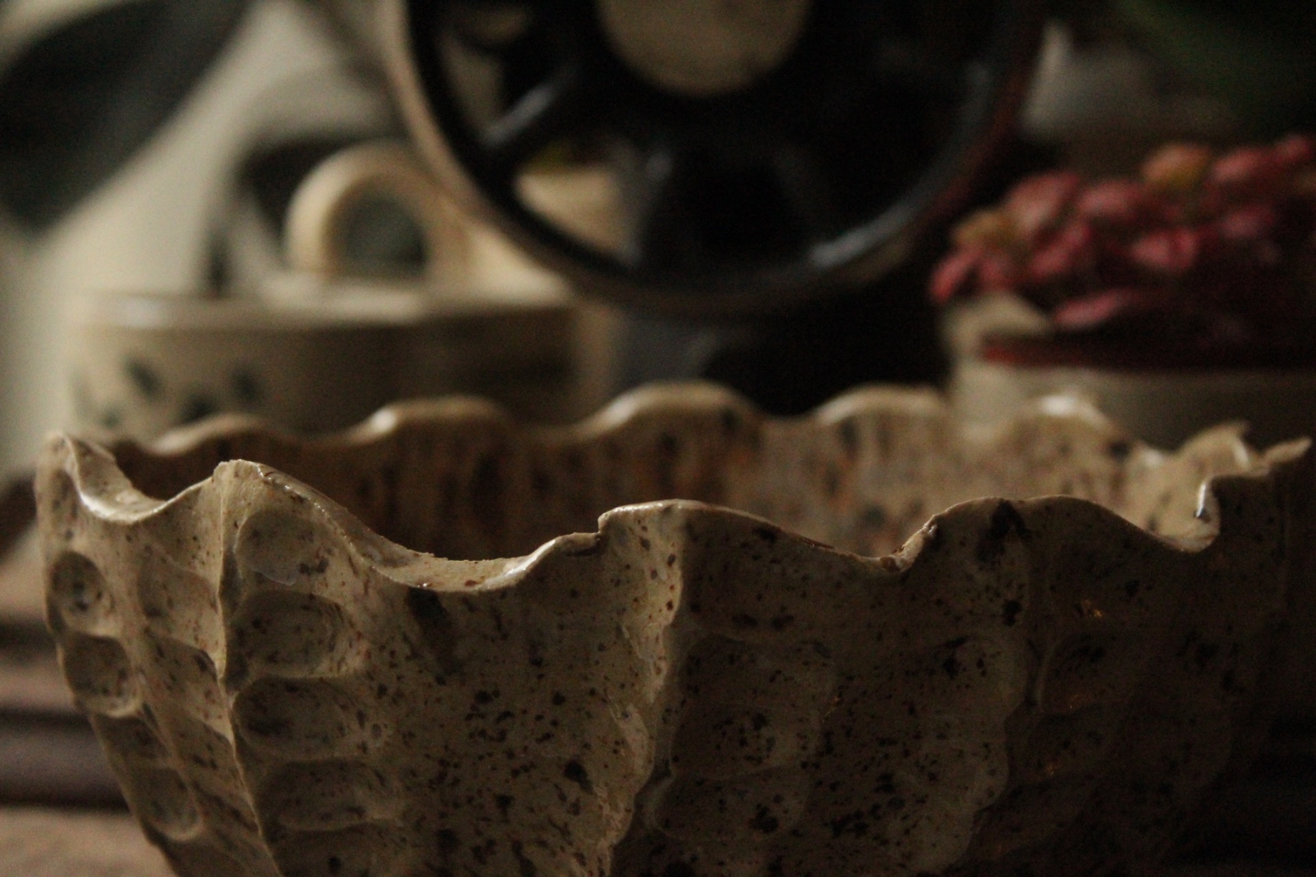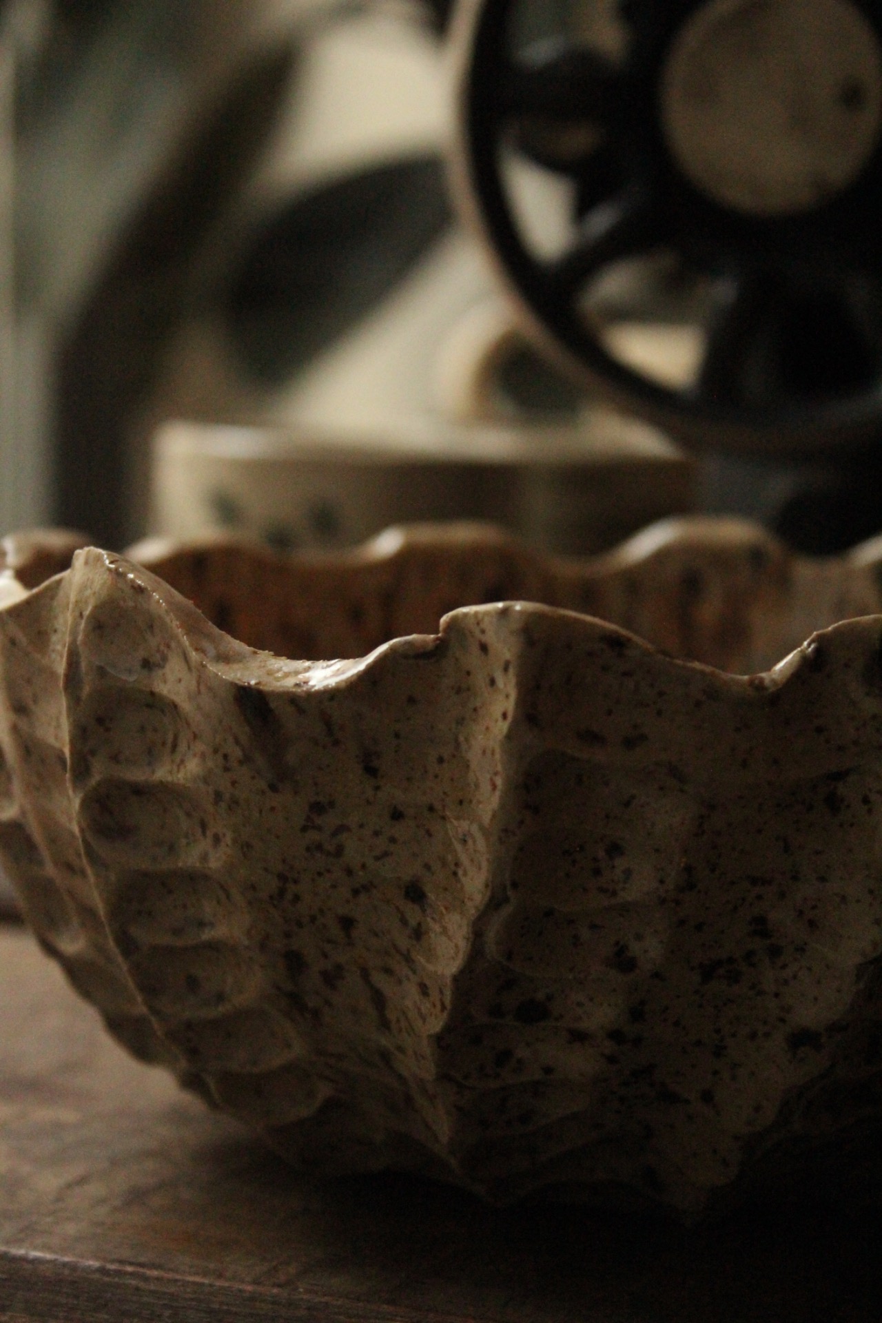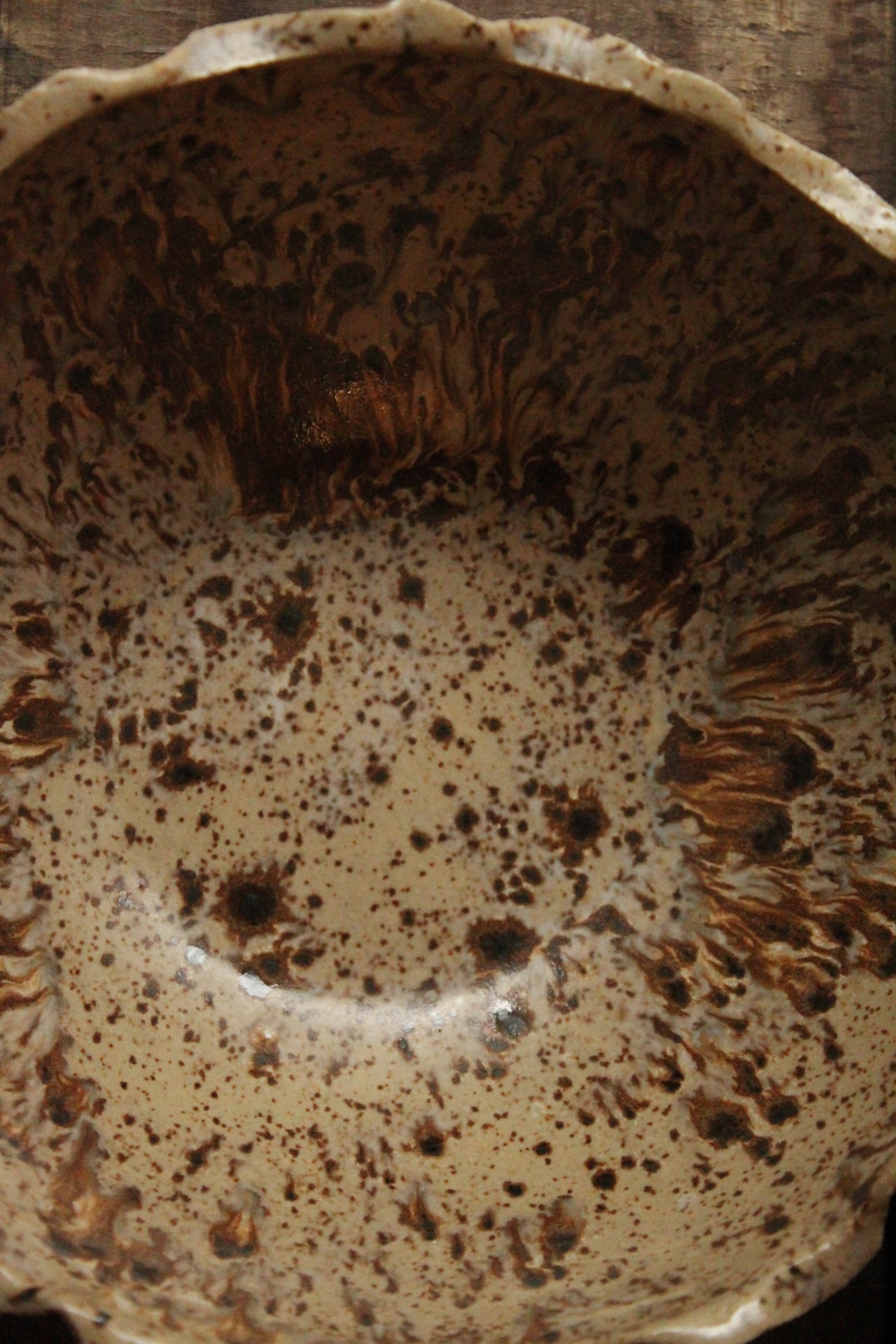 Bowl per insalata nei toni del sabbia con puntinatura più scura.